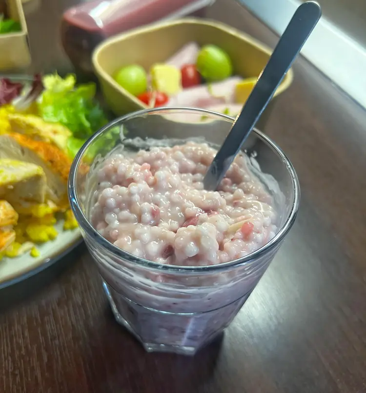 Elkészítem az alap zabkását 2dl növényi tejet felteszek főni, majd édesítőt és 50g zabpelyhet keverek hozzá. Megfőzöm, majd rétegezve egy pohárba teszem. Az aljára kerül a lekvár, majd a zabkása réteg, majd az eritrites darált dió-mák keverék, majd megint a zabkása, majd lekvár réteggel lezárom.